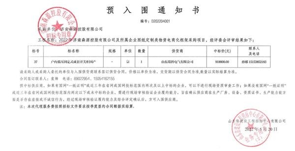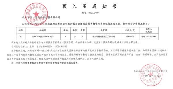 经过经营管理部积极认真对待,在5月20日成功入围10kV环网柜-HXGN(国产)、户内低压固定式成套开关柜(国产)两个标段。此次成功入围对我公司在济南地区业务扩展奠定基础,为后期业务进展做好铺垫。